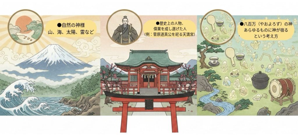・自然の神様: 山、海、太陽、雷など(例:富士山そのものを神とするなど)